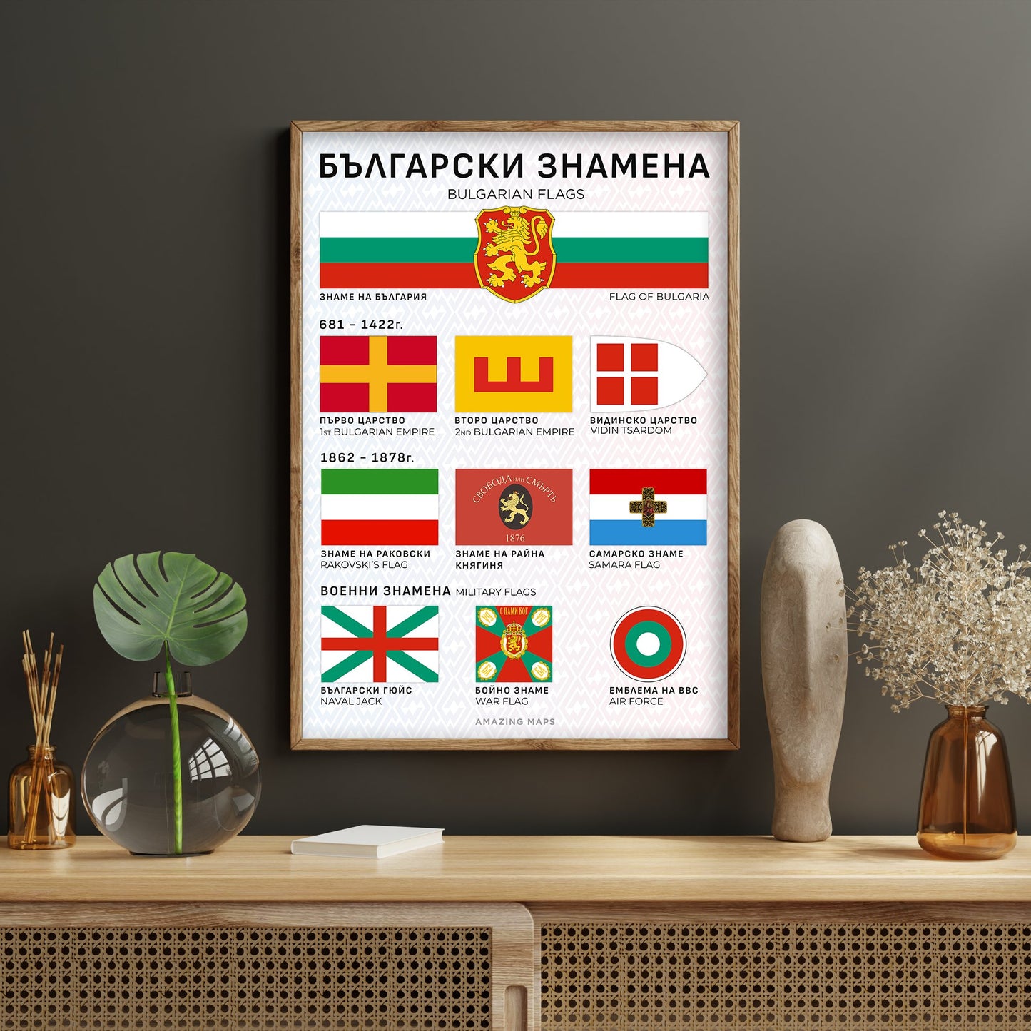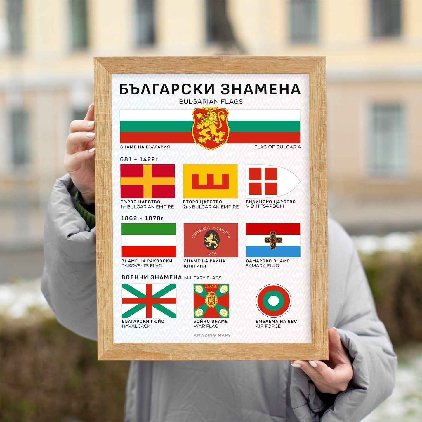Enhance your decor with this stunning flag poster depicting the history of the Bulgarian flag. Transform an empty space or give as a thoughtful gift. Immerse yourself in its intricate details and transport yourself to another world. Elevate your home or gift it to a loved one. With its delicate details, this print comes to life, inspired by historical posters.