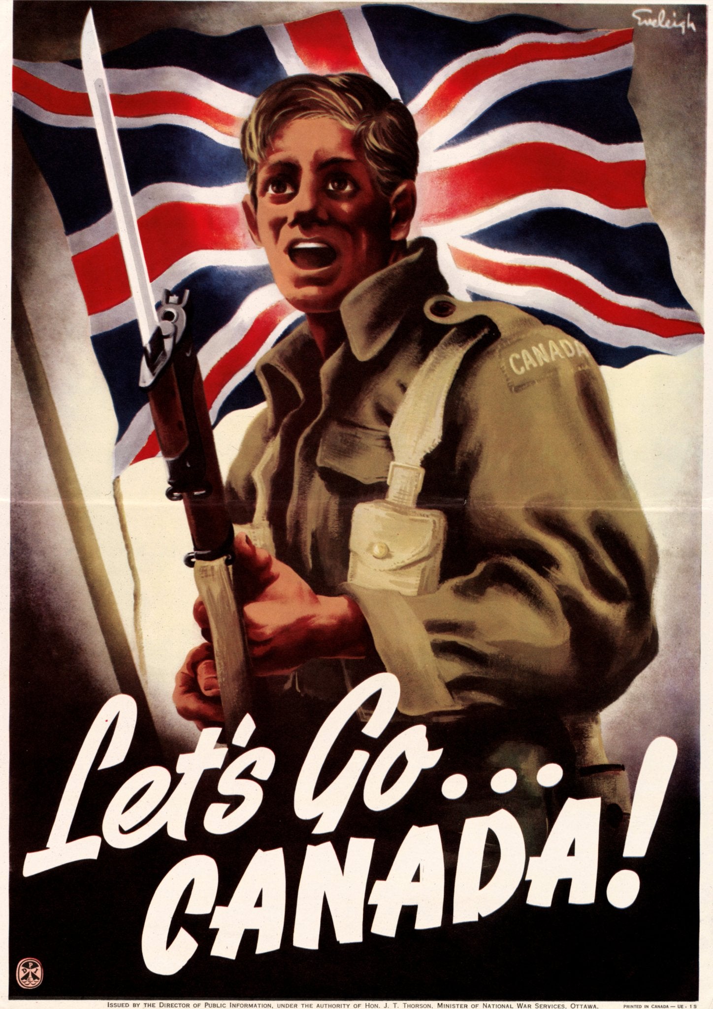 Enhance your decor with this stunning propaganda poster depicting the Canadian and British spirit. Transform an empty space or give as a thoughtful gift. Immerse yourself in its intricate details and transport yourself to another world. Elevate your home or gift it to a loved one. With its delicate details, this print comes to life like the original historic poster.