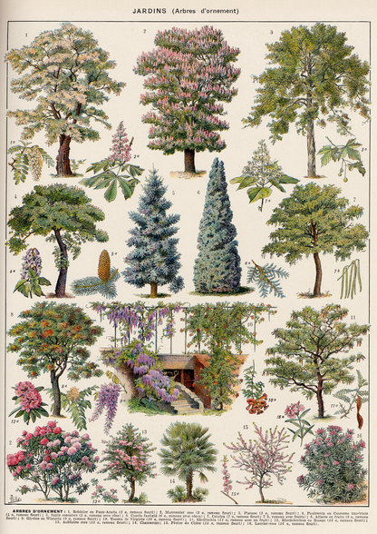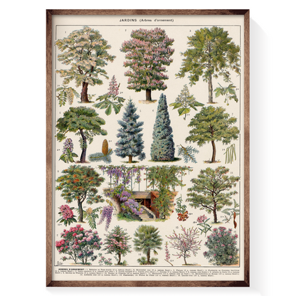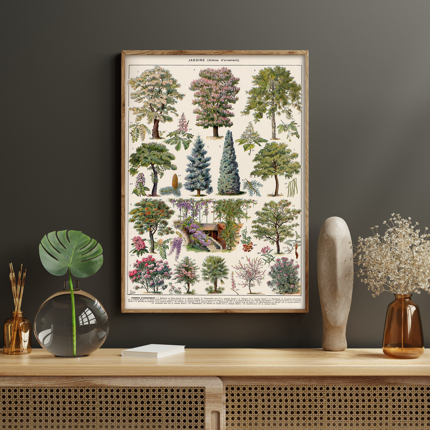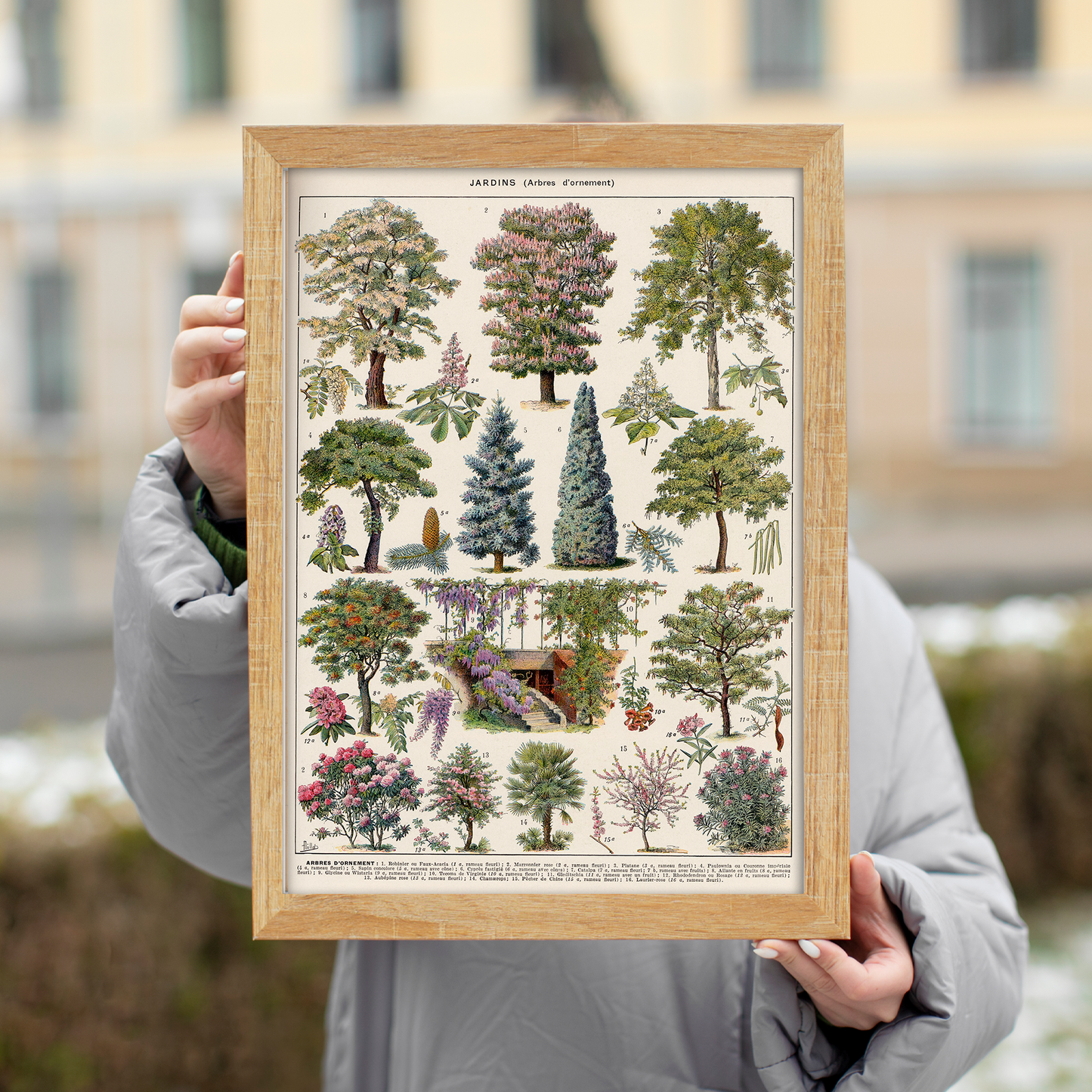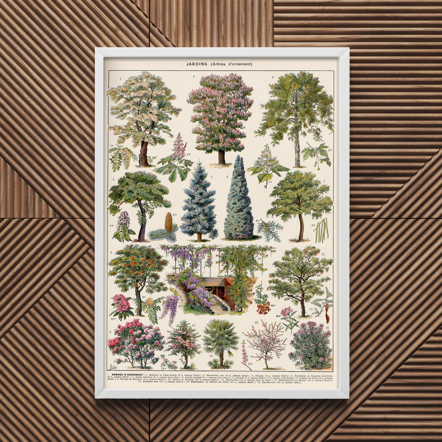 Enhance your decor with this stunning illustrative poster depicting different types of trees. Transform an empty space or give as a thoughtful gift. Immerse yourself in its intricate details and transport yourself to another world. Elevate your home or gift it to a loved one. With its delicate details, this print comes to life like the original historic poster.