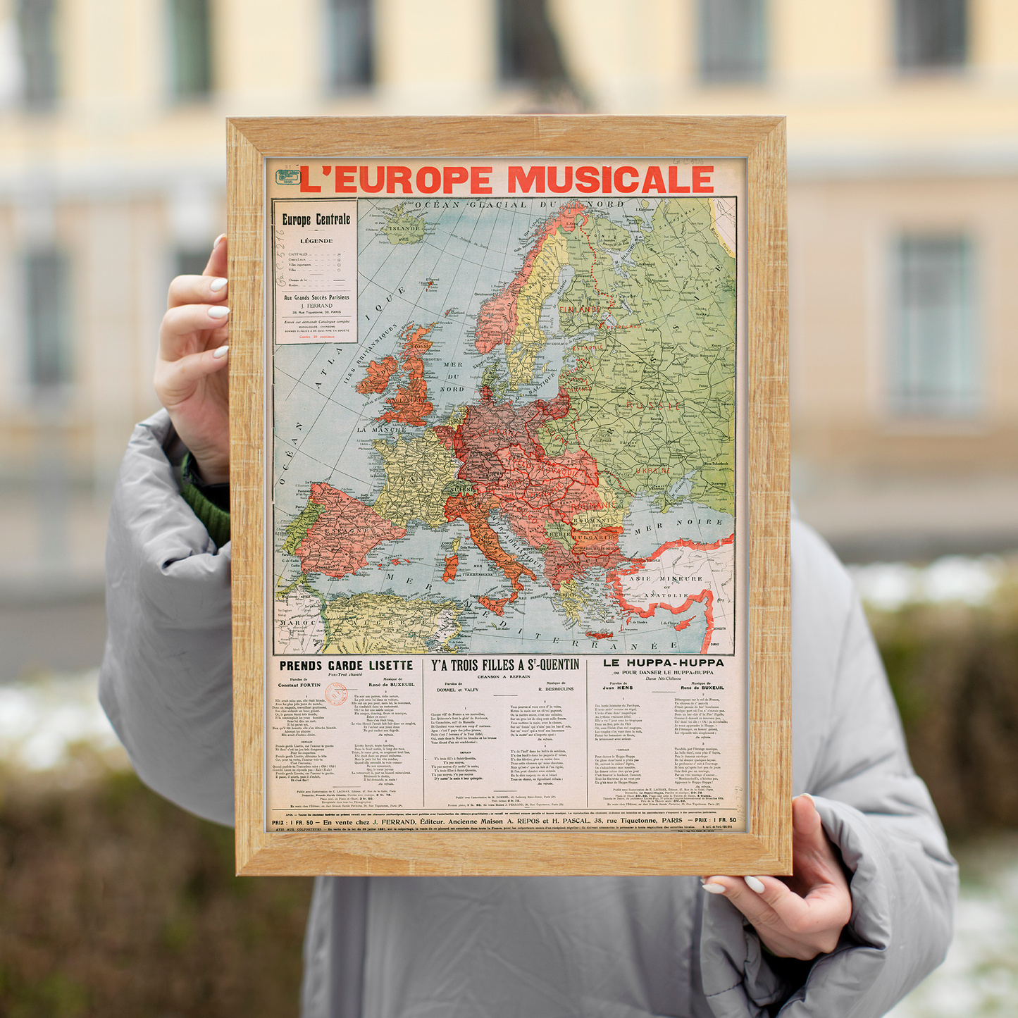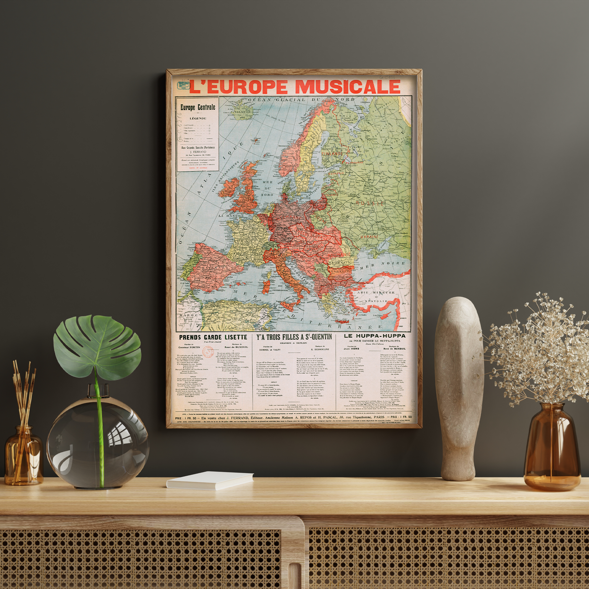 Enhance your decor with this stunning map depicting the music of Europe in French. Transform an empty space or give as a thoughtful gift. Immerse yourself in its intricate details and transport yourself to another world. Elevate your home or gift it to a loved one. With its delicate details, this print comes to life like the original historic one.