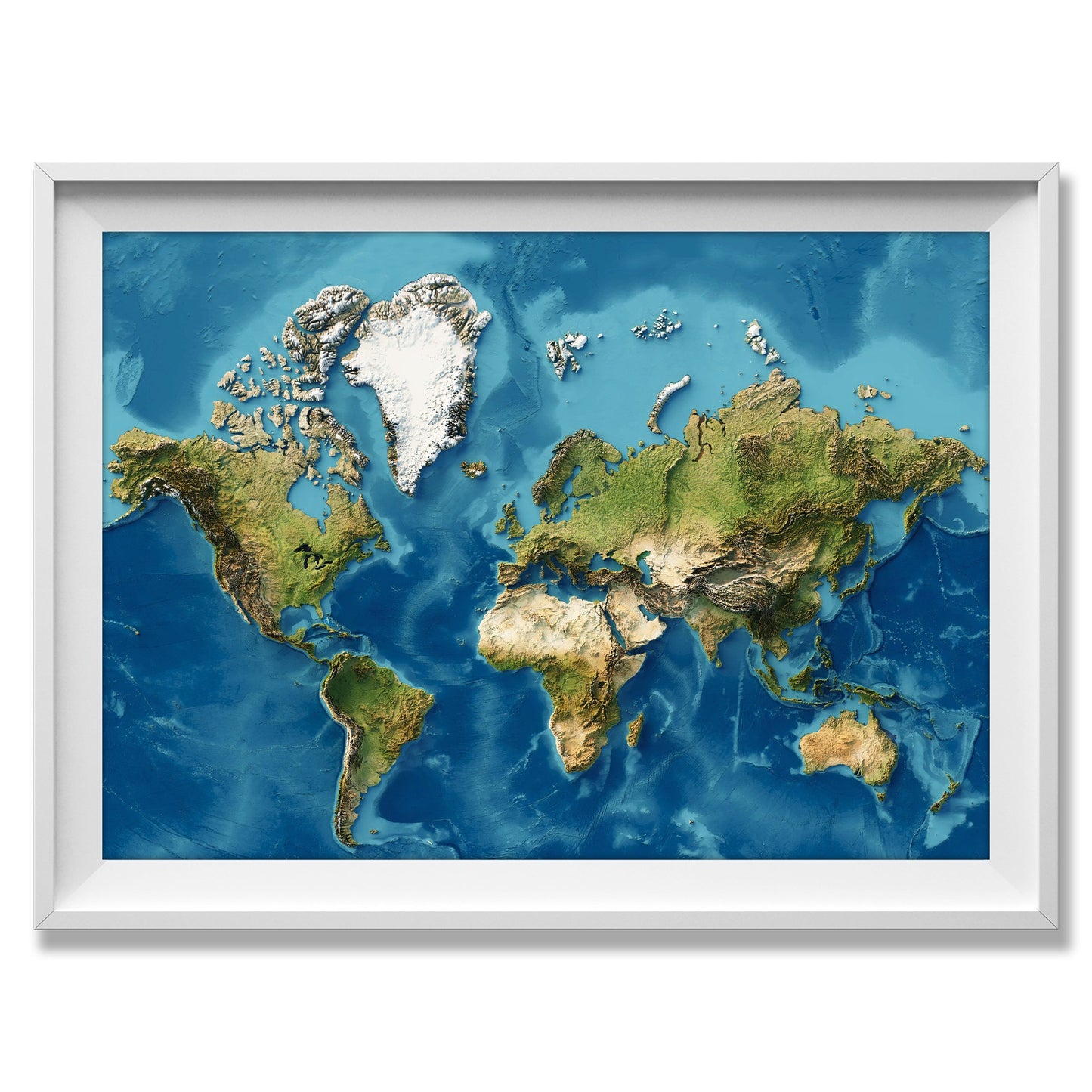 Enhance your decor with this stunning map print depicting the World. Transform an empty space or give as a thoughtful gift. The print boasts intricate shading that creates a lifelike effect. Immerse yourself in its intricate details and transport yourself to another world. Elevate your home or gift it to a loved one. With its delicate shading, this print comes to life with a mesmerizing 3D effect.