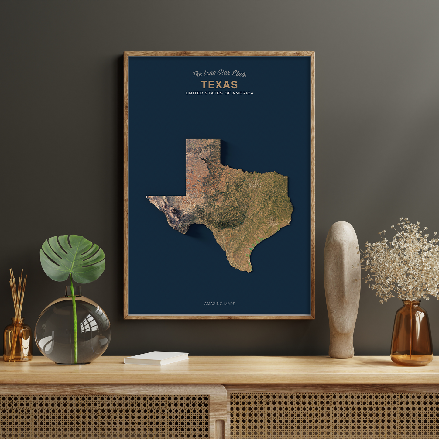 Enhance your decor with this stunning map print depicting the state of Texas, part of the United States of America. Transform an empty space or give as a thoughtful gift. The print boasts intricate shading that creates a lifelike effect. Immerse yourself in its intricate details and transport yourself to another world. Elevate your home or gift it to a loved one. With its delicate shading, this print comes to life with a mesmerizing 3D effect.